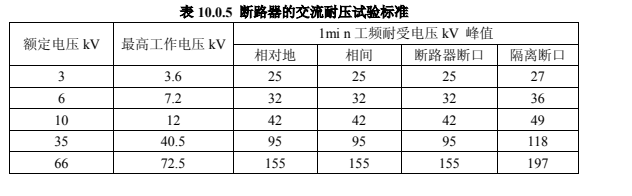 斷路器的交流耐壓試驗應在分、合閘狀態下分別進行,試驗電壓按照表 10.0.5 規定執行。