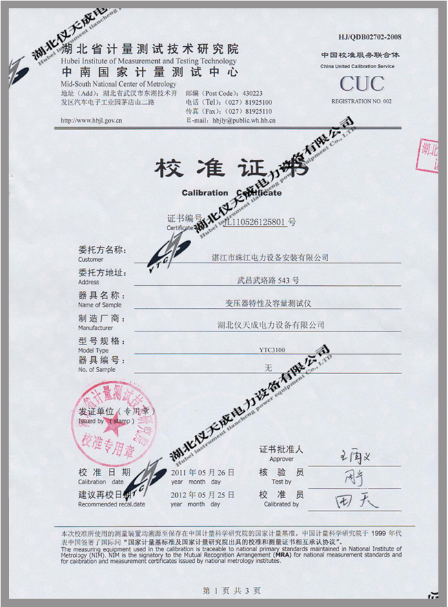 上一篇:YTC2220數字雙鉗相位伏安表鑒定證書 下一篇:YTC3317全自動變比組別測試儀鑒定證書